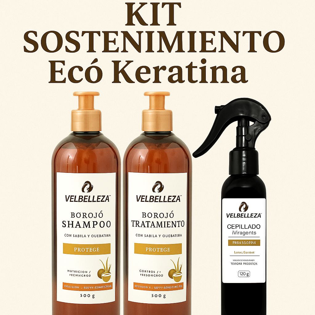 Este kit de mantenimiento completo prolonga los resultados del alisado realizado con la Ecó Keratina. Incluye Shampoo, Tratamiento de Borojó y Cepillado Inteligente, con propiedades fortalecedoras y reparadoras para mantener un cabello liso y saludable.